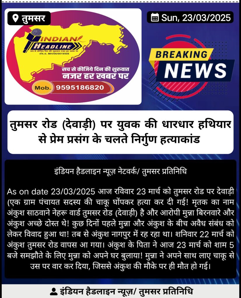 आज रविवार 23 मार्च को तुमसर रोड पर एक ग्राम पंचायत सदस्य की चाकू घोंपकर हत्या कर दी गई! मृतक का नाम अंकुश साठवाने नेहरू वार्ड तुमसर रोड (देवाड़ी) है और आरोपी मुन्ना बिरनवारे और अंकुश अच्छे दोस्त थे। कुछ दिनों पहले मुन्ना और अंकुश के बीच अवैध संबंध को लेकर विवाद हुआ था! तब से अंकुश नागपुर में रह रहा था। शनिवार 22 मार्च को अंकुश तुमसर रोड वापस आ गया। अंकुश के पिता ने आज 23 मार्च को शाम 5 बजे समझौते के लिए मुन्ना को अपने घर बुलाया! मुन्ना ने अपने साथ लाए चाकू से उस पर वार कर दिया, जिससे अंकुश की मौके पर ही मौत हो गई।
