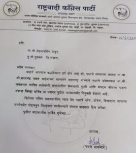 तुमसर: राकांपा के राष्ट्रीय अध्यक्ष शरद पवार के विचार जन-जन तक पहुंचाने राकांपा (शरद पवार) गुट के प्रदेशाध्यक्ष जयंत पाटिल के निर्देश पर जिला राकांपा अध्यक्ष चरण वाघमारे द्वारा जिला राकांपा के सचिव पद पर पूर्व नगरसेवक मेहताब सिंह ठाकुर की नियुक्ति की गई है. ठाकुर को संगठन का अच्छा खांसा अनुभव होकर उनकी समाज में काफी पैठ है. इस कारण वाघमारे द्वारा उनका जिला सचिव पद के चयन किया. उन्हें नियुक्ति पत्र देते समय जिलाध्यक्ष वाघमारे के साथ ही अन्य पदाधिकारी उपस्थित थे.