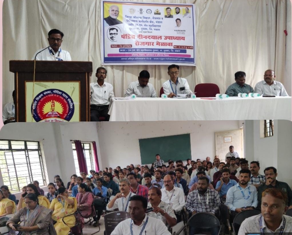 तुमसर : गोंदिया शिक्षण संस्थेद्वारा संचलित सेठ नरसिंगदास मोर कला, वाणिज्य व श्रीमती गोदावरीदेवी सराफ विज्ञान महाविद्यालयात नुकताच रोजगार मेळावा आयोजित करण्यात आला. कौशल्य विकास, रोजगार, उद्योजकता व नाविन्यता विभाग महाराष्ट्र शासन व जिल्हा कौशल्य विकास, रोजगार व उद्योजकता मार्गदर्शन केंद्र, भंडारा आणि सेठ नरसिंगदास मोर महाविद्यालय तुमसर यांच्या संयुक्त विद्यमाने पंडित दीनदयाल उपाध्याय रोजगार मेळाव्याचे आयोजन करण्यात आले होते. उद्घाटन कार्यक्रमाच्या अध्यक्षस्थानी प्रभारी प्राचार्य डॉ.आर. के. दिपटे हे होते. प्रास्ताविक डॉ. सुधाकर झळके (सहाय्यक आयुक्त, जिल्हा उद्योजकता मार्गदर्शन केंद्र, भंडारा) यांनी केले. या कार्यक्रमाला श्री पंकज बुधे (प्राचार्य, मायनिंग औद्योगिक प्रशिक्षण संस्था, तुमसर), श्री पांडव, (रोजगार अधिकारी), श्री सी. एस. राऊत, (शासकीय औद्योगिक प्रशिक्षण संस्था, तुमसर), प्रा देवेंद्र सोनटक्के (आठवले समाजकार्य महाविद्यालय, भंडारा) हे प्रमुख अतिथी म्हणून उपस्थित होते.