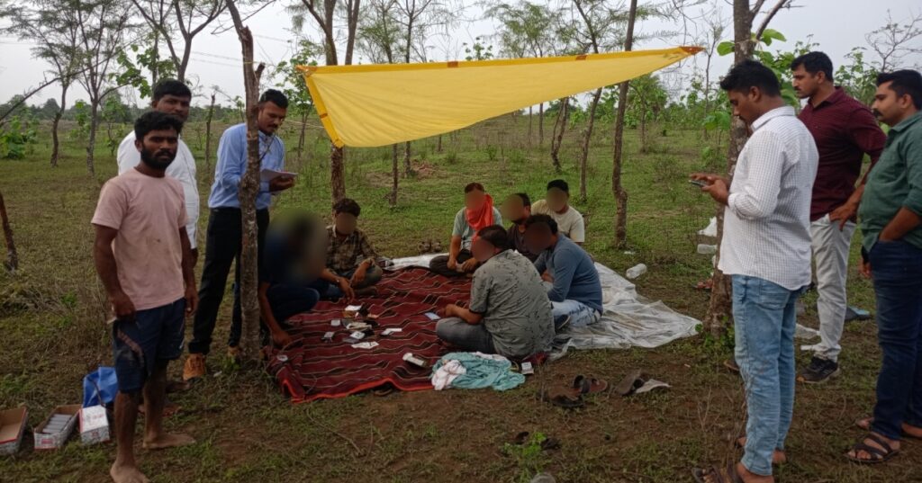 तुमसर: पोलीस स्टेशन तुमसर पो. नि. संजय गायकवाड सा., यांचे मार्गदर्शाप्रमाणे पो. स्टे. तुमसर हद्दीत पेट्रोलींग करिता पोउपनि प्रविण सयाम, पोउपनि अलिप बावने, पो.शि. राजकुमार गि-हेपुंजे ब..न.362, पो.शि. नितनवरे ब.न. 113, पो.शि. दमाहे ब.न.83, पो.शि. फेंडर ब.न. 1429 हे रवाना होवुन मौजा, उमरवाडा भागात पेट्रोलींग करीत असतांनी, गुप्त बातमीदाराकडुन खबर मिळाली की, मौजा-उमरवाडा ते सितेपार जाणा-या रोडच्या बाजुला असलेल्या सागवान नर्सरी मध्ये सार्वजनिक ठिकाणी खुल्या जागेत काही इसम 52 तास पत्तीचे कटपत्ती जुगारावर पैशाची बाजी लावुन पैशाचा हार-जीतचा जुगार खेळ खेळत आहेत. अशा माहीतीवर मा. नरुल हसन सा. पोलीस अधिक्षक भंडारा यांचे मार्गदर्शनात वेगवेगळे पथक तयार करुन मुखबीरच्या माहीतीप्रमाने मौजा-उमरवाडा ते सितेपार जाणा-या रोडच्या बाजुला असलेल्या सागवान नर्सरी मध्ये सार्वजनिक ठिकाणी खुल्या जागेत दि. 10/07/2025 चे 17/30 वा. तुमसर पोलीसाचे पथकाने जुगार रेड घातली असता सदर ठिकाणी सागवनच्या झांडाना वरुन पिवळ्या रंगाची ताळपतरी बांधुन त्याचे खाली दरीवर आरोपी क्र. 1) चेतन उर्फ विक्की रामदास सार्वे वय 32 वर्षे रा. शिवाजी नगर, गोवर्धन नगर तुमसर, 2) संतोष विजय लिल्हारे वय- 40 वर्षे रा. देव्हाडी 3) साहील विष्णु वैद्ये वय 22 वर्षे रा. हसारा 4) स्वप्निल सुरेश कुंभरे वय- 28 वर्षे रा. गोवर्धन नगर तुमसर 5) विक्रम किसनचंद रावलानी वय- 47 वर्षे रा. शिवाजी नगर तुमसर व 6) संजय हंसराज साठवणे वय 30 वर्षे रा. शिवाजी नगर तुमसर असे मिळुन आले व काही ईसम पळुन गेले फरार आरोपी नामे 7) आकाश रमेश महालगावे वय 30 वर्षे रा. बडा बाजार चौक तुमसर 8) योगेश हिरालाल गायधने वय 30 वर्षे रा. शहर वार्ड तुमसर 9) धर्मेंद्र उर्फ गोब-या बनकर वय 25 वर्षे रा. उमरवाडा 10) साहील धकाते वय- 24 वर्षे रा. नेहरु वार्ड तुमसर 11) संदिप ठाकरे वय-30 वर्षे रा. शिवाजी वार्ड तुमसर 12) ईमरान शेख वय- 35 वर्षे रा. मालविय वार्ड तुमसर असे असुन सर्व इसम गोलाकार बसुन मध्यभागी एका दरीवर 52 तासपत्तीचे कटपत्ती जुगारवर पैशाची बाजी लावुन पैशाचा हार-जीतचा जुगार खेळ खेळत असल्याचे निष्पन्न झाल्याने पोउपनि प्रविण सयाम पो. स्टे. तुमसर यांचे तक्रारीवर पो.स्टे. तुमसर येते अप क्र. 441/2025 कलम 12(अ) मजुका चा गुन्हा नोंद करण्यात आला.