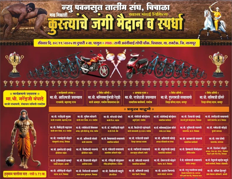 नगरधन :- रामटेक तालुक्यातील चिचाळा गाव कुस्तीप्रेमींसाठी 2 नोव्हेंबरला एक ऐतिहासिक क्षण अनुभवणार आहे. पारंपरिक मातीच्या कुस्तीला नवे बळ देण्यासाठी न्यू पवनसुत तालीम संघ, चिचाळा यांच्या वतीने विदर्भातील सर्वात मोठा भव्य इनामी कुस्ती आमदंगल आयोजित करण्यात आले आहे. या कुस्ती स्पर्धेचे प्रमुख आयोजक मीताराम दमाहे, राजहंस माहुले, देवलाल दमाहे, संजय दमाहे, भद्दू बंधाटे, दीक्षित दमाहे, साहिल नरेंद्र बंधाटे, सुरेश बंधाटे तसेच समस्त चिचाळा ग्रामवासी असून, संपूर्ण चिचाळा गाव या सोहळ्याच्या तयारीत रंगले आहे. या आमदंगलीत महाराष्ट्रासह देशातील नामांकित आणि दिग्गज पैलवान सहभागी होणार असुन दमदार झुंजी आणि कौशल्यपूर्ण डावपेच यांचा मेळ या मैदानावर प्रेक्षकांना पाहायला मिळणार आहे.