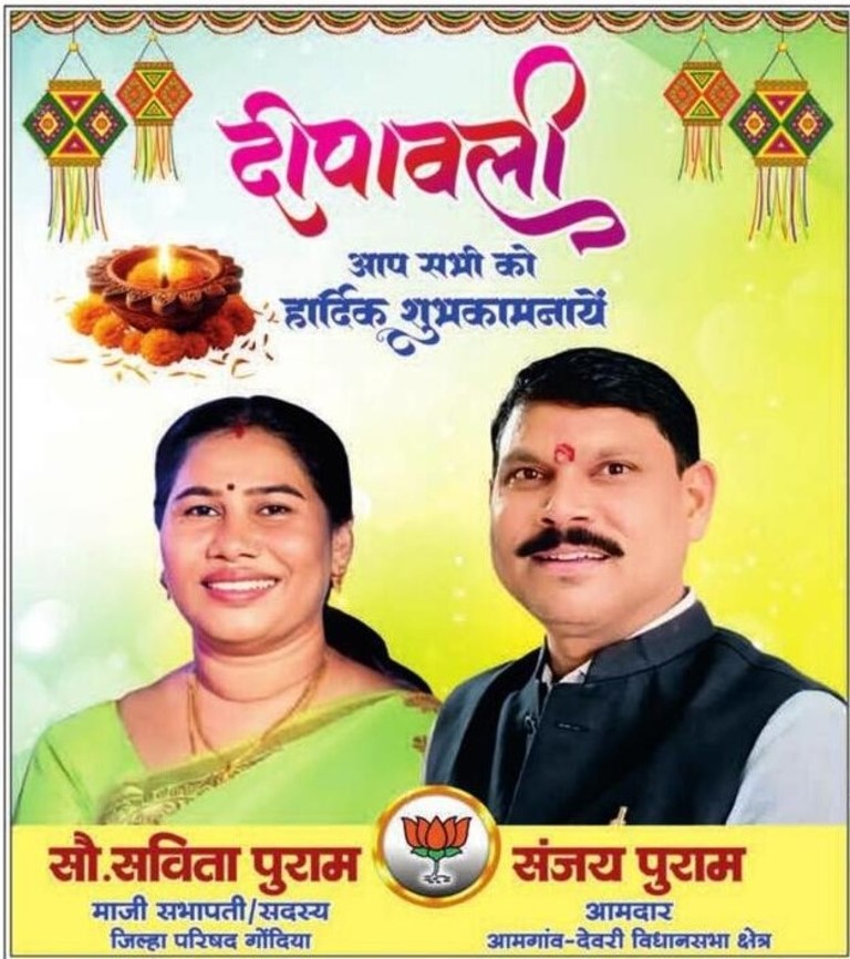 संजय हनमंतराव पुराम आमदार आमगाव देवरी विधानसभा क्षेत्र: दीपावली और नव वर्ष की हार्दिक बधाई और शुभकामनाएं! यह पर्व आपके जीवन में सुख, समृद्धि और खुशियां लेकर आए। दीपावली की शुभकामनाएं: यह रोशनी का त्योहार आपके जीवन में शांति और खुशी लाए। आप और आपका परिवार हमेशा खुशियों से भरा रहे। दिवाली की मिठाइयों की मिठास आपके जीवन को और भी मधुर बना दे। नव वर्ष की शुभकामनाएं: यह नया साल आपके लिए ढेर सारी खुशियां और सफलता लेकर आए। आपके सभी सपने सच हों और जीवन उज्जवल हो।